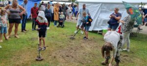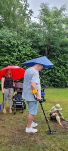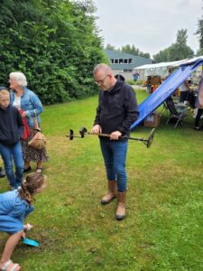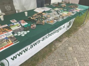 Aldwin en Joop zochten met kinderen achter de kraam naar muntjes met de metaaldetector. Het was een daverend succes! We hebben geprobeerd het veld zo netjes mogelijk weer achter te laten. Op een gegeven moment was het weer echter toch te slecht om door te gaan met de gevoelige apparatuur, maar dat mocht de pret niet drukken. De scherventafel werd bewonderd en betast door jong en oud. Een paar kinderen wilden ook graag lid worden, deze hebben wat leuke boekjes mee gekregen. We mochten ook wat schooljuffen en -meesters treffen, die graag een keer een bezoek van een archeoloog in de klas willen hebben.