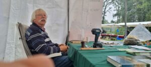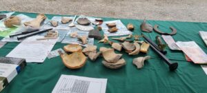 Zondag 31 juli was onze vereniging weer aanwezig bij de Oertijdmarkt. Van ouds is het een markt met voornamelijk mineralen en fossielen, maar ook geschiedenis komt aan bod. Dit keer was het niet op het terrein van het Hunebedcentrum, maar in Emmen achter het stadion. Enthousiastelingen zijn er in geslaagd de populaire markt toch door te laten gaan. Ondanks het wat miezerige weer (af en toe kwam er toch best een regenbui naar beneden) was de markt goed bezocht (naar schatting zo’n 3000 bezoekers). De kraam met de scherventafel en rapporten en tijdschriften werd bezocht door mensen uit de omgeving en uit elders in het land op vakantie. Eva, Roel en Aldwin vertegenwoordigden het bestuur, met welkome aanvulling van ons lid Joop Sikkema. Roel maakte voor wie het leuk vond amuletten van scherven van de opgravingen in Adorp, ze kregen deze zo mee: want archeologie is van iedereen!