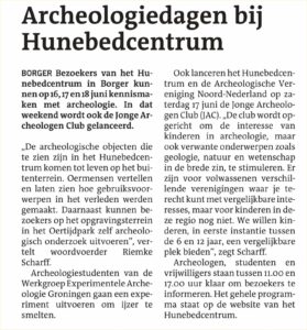 In het weekend van 16, 17 en 18 juni zijn de landelijke Archeologiedagen. Ook in Noord-Nederland kun je zien hoe archeologen werken en waarom zij dat doen. De AWN is aanwezig bij het Hunebedcentrum in Borger. Daar zullen de vrijwilligers vooral aandacht geven aan de jonge bezoekers. In onderstaand krantartikel uit het Dagblad van het Noorden van 10 juni 2023 is te lezen wat bezoekers kunnen beleven.